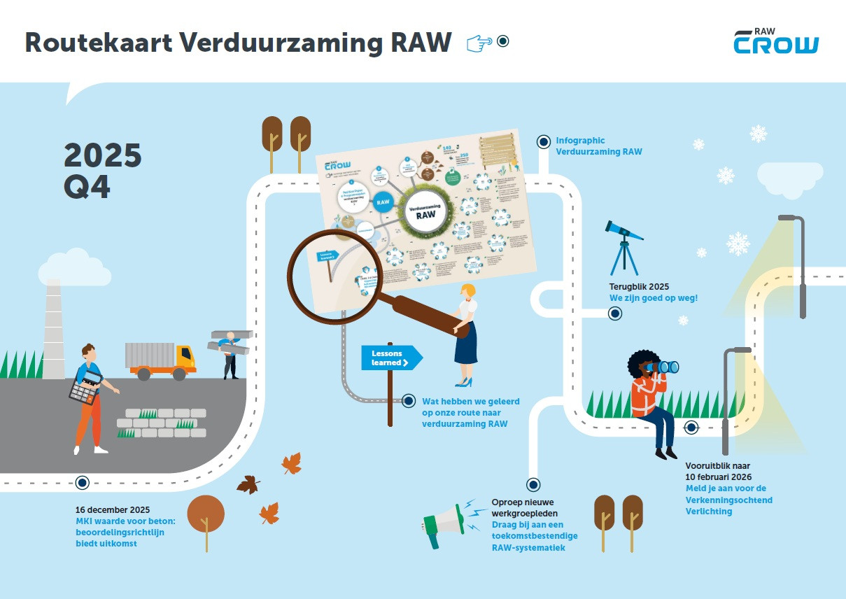 In het vierde kwartaal hebben we aandacht besteed aan de beoordelingsrichtlijn (BRL) die kan helpen bij het vaststellen van een MKI-waarde voor beton. Verder hebben we een infographic gedeeld over de stappen die we tot nu toe met verduurzaming va de RAW-systematiek hebben gezet en een overzicht met belangrijke ontwikkelingen in 2025. Kijk ook goed naar de oproep voor op te starten nieuwe werkgroepen, want misschien zit er een voor jou tussen!