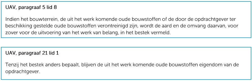 In artikel 01.01.01 lid 01 van de Standaard RAW Bepalingen is de UAV van toepassing verklaard. Op het omgaan met uit het werk vrijgekomen materialen zijn met name de volgende bepalingen uit de UAV van invloed: