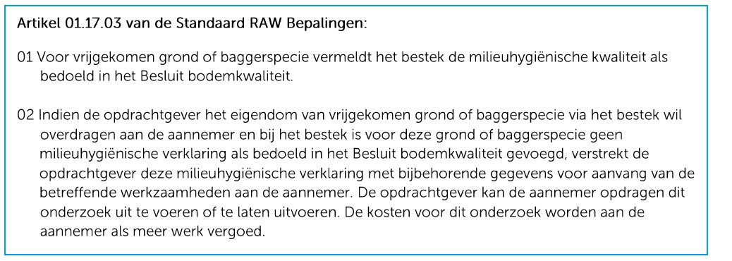 2. In relatie tot het Besluit bodemkwaliteit is als voorbeeld te noemen het ‘in eigendom overdragen van vrijgekomen grond’. Dit is mogelijk, mits de kwaliteit van het vrijgekomen materiaal zodanig is dat het materiaal niet hoeft te worden afgegeven aan een in richting. Als de opdrachtgever vrijgekomen grond of baggerspecie, die op of in de bodem zijn toegepast, in besteksposten aan de aannemer in eigendom overdraagt, dan geldt: