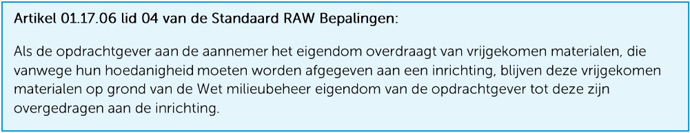 dat het aan een inrichting wordt overgedragen. In besteksposten die betrekking hebben op materialen die volgens regelgeving van het bevoegd gezag niet hoeven te worden afgegeven aan een inrichting, kan gebruik worden gemaakt van de tekst ‘De aannemer wordt eigenaar van de vrijgekomen materialen’. In de betreffende resultaatsbeschrijvingen van de RAW-catalogus is deze mogelijkheid opgenomen. Uiteraard moet de opdrachtgever in de bestekspost wel gegevens, aard en omvang van de verontreinigingen, over debetreffende materialen opnemen. Deze gegevens (aard en omvang van de verontreinigingen) moeten de aannemer in staat stellen bij inschrijving rekening te houden met de kosten van de verplichting.