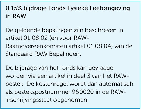 In een RAW-bestek is het mogelijk om een bijdrage van 0,15% van de opdrachtsom voor het Fonds Fysieke Leefomgeving (voorheen Fonds Collectieve Kennis-CT (FCK-CT) ) te verlangen. Dit is voor de opdrachtgever een vrijwillige bijdrage die via het bestek door de aannemer wordt overgemaakt aan het fonds. In veel RAW-bestekken wordt deze bijdrage ook daadwerkelijk verlangd, maar waaraan wordt dit geld uiteindelijk besteed?
