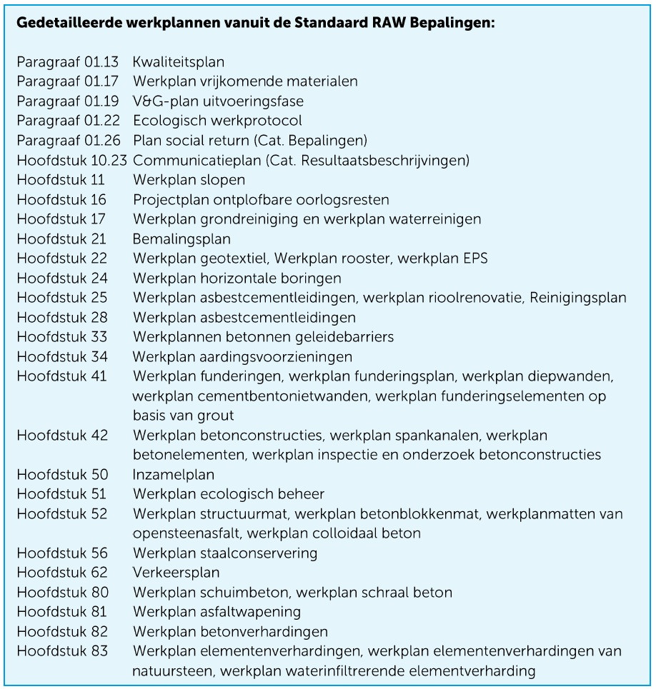 Gedetailleerde werkplannen kunnen bovendien deel uitmaken van een kwaliteitsplan voor het werk als de aannemer een volgens ISO-normering gecertificeerd bedrijf moet zijn. Deze eis aan het bedrijf moet in het bestek zijn opgenomen. Paragraaf 01.13 van deel 3 in het bestek is hiervoor de aangewezen plaats.