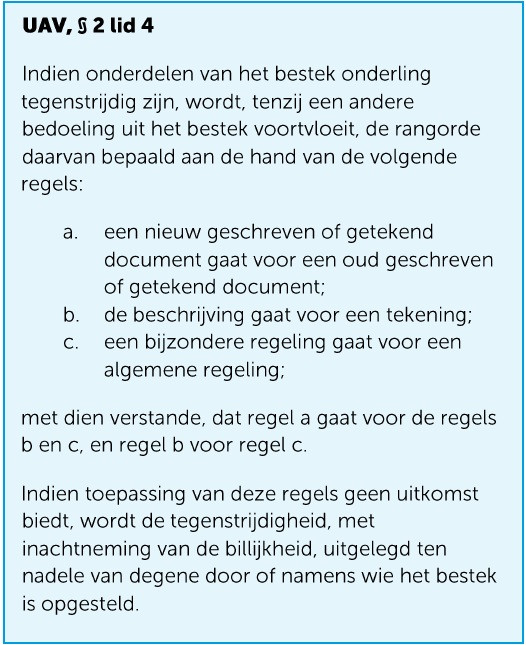 Bij het beantwoorden van vragen over tegenstrijdigheden in een bestek is deze paragraaf belangrijk.