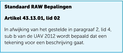 Tot slot is het van belang om de bepalingen in de Standaard RAW Bepalingen goed te kennen voor de beschreven werkzaamheden. Zo is bijvoorbeeld voor staalconstructies in hoofdstuk 43 een afwijking op de UAV opgenomen: bij tegenstrijdigheden geldt dat een tekening (van staalconstructies) altijd voor een beschrijving gaat!