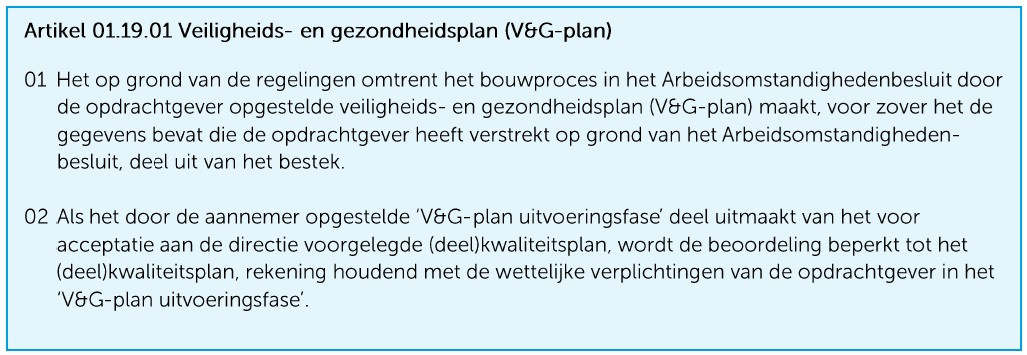 In deze bepaling wordt toegelicht dat de opdrachtgever vanuit het Arbeidsomstandighedenbesluit, bij bepaalde bouwwerken, verantwoordelijk is voor het (laten) opstellen van een V&G-plan. In hetArbeidsomstandighedenbesluit staat wat er tenminste vermeld moet worden in het V&G-plan. Lid 01 van deze bepaling stelt dat het door de opdrachtgever opgestelde V&G-plan deel uitmaakt van het bestek.