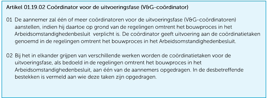 In deze bepaling, onder lid 01 wordt toegelicht dat de aannemer de verplichting kan hebben, vanuit het Arbeidsomstandighedenbesluit, om één of meer coördinatoren voor de uitvoeringsfase aan te stellen. En dat die coördinator dan uitvoering geeft aan de coördinatietaken die beschreven staan in het Arbeidsomstandighedenbesluit: