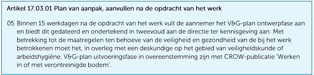 In paragraaf 17.03 ‘informatieoverdracht’ staat een bepaling over het V&G-plan in relatie tot het werken in verontreinigde bodem.