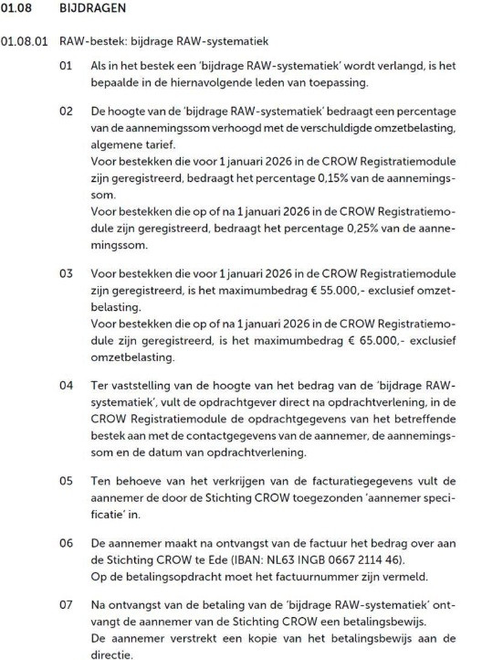Vanaf 1 januari 2026 geldt een nieuw percentage voor de bijdrage RAW-systematiek: 0,25% van de aannemingssom. Dit vervangt het huidige percentage van 0,15%. Het moment van registratie van het bestek is bepalend voor welk percentage van toepassing is.
