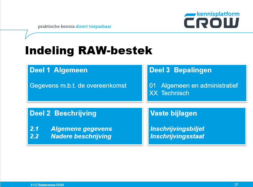 Tijdens onze basiscursus RAW laten we daarnaast de vaste indeling van een RAW bestek zien. Naast de drie vaste delen waaruit een RAW bestek bestaat wordt daarbij de inschrijfstaat en het inschrijfbiljet als vaste bijlagen benoemd.